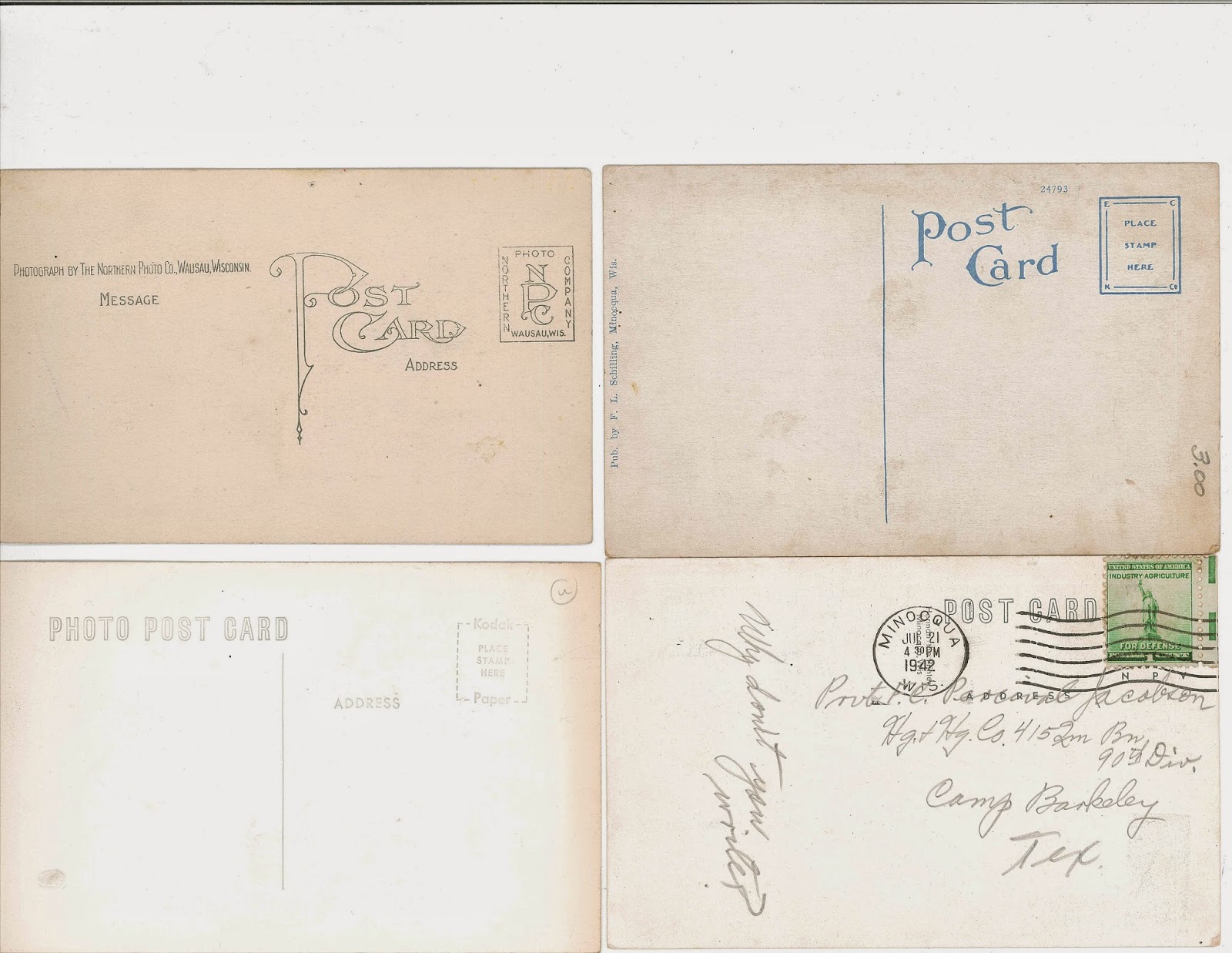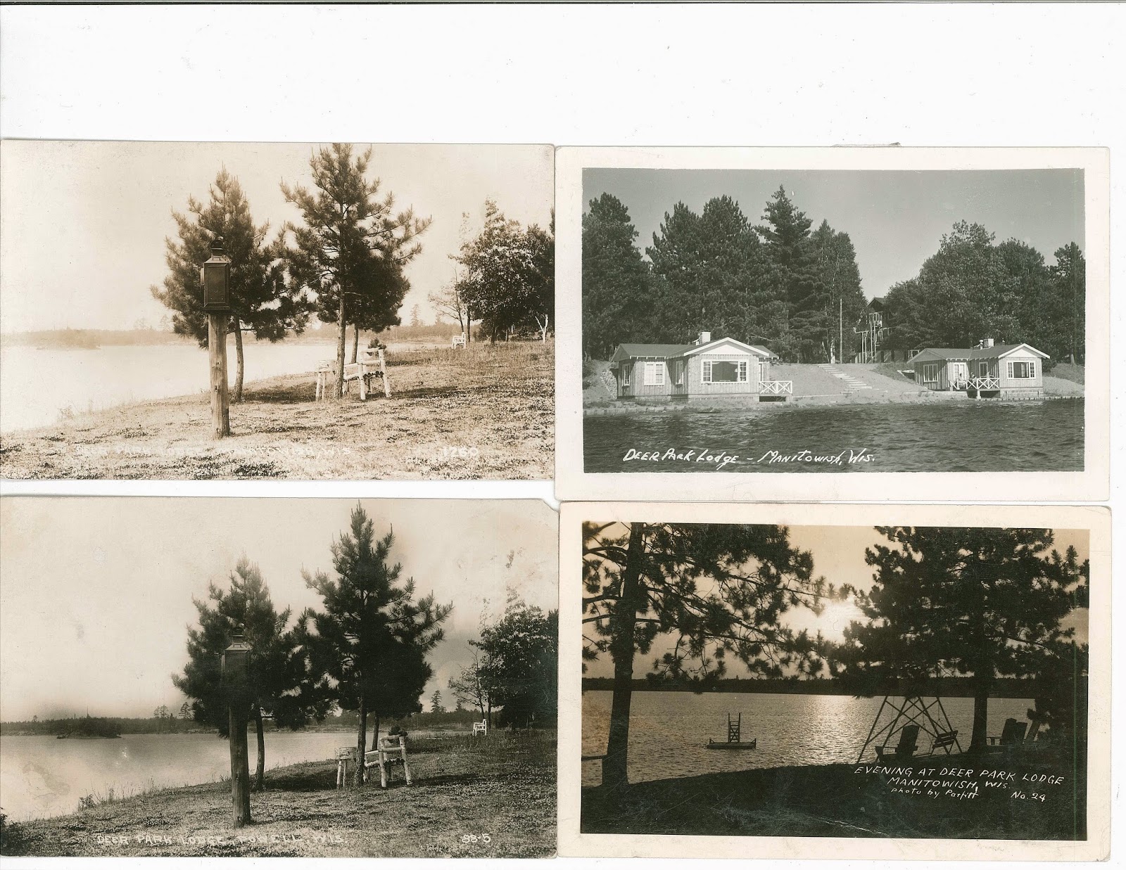 Other postcards depict (in no particular order): Koerner's Spider Lake Resort, Koerner's Coffee Shop and Oval Bar, Buck's Resort, Voss' Birchwood Lodge, Voss' Breezy Point, Little Bohemia, Rudy's Rest Haven, Ilg's Camp, Deer Park Lodge, Island Lake Log Cabins, Island Lake Resort, Northern Lights Resort, Warnier's, Red Feather Lodge, Twin Pines Resort, Meinel's, Williamson's Stone Lake Resort, Beaumont's Island Resort, Lange's Sylvan Lodge, Balaty's, Lakewood Lodge, Win-Mar, 30-30 Lodge, Rest Lake Dam and Fish Hatchery, Arial Views from the Tower, post office, Hanson's Hardware, LaPorte's, Harry's Supermarket, Theilacker's Ehlert's.